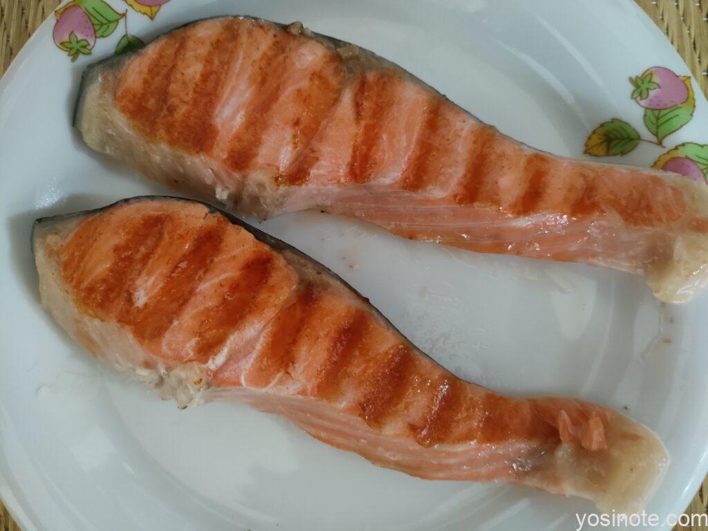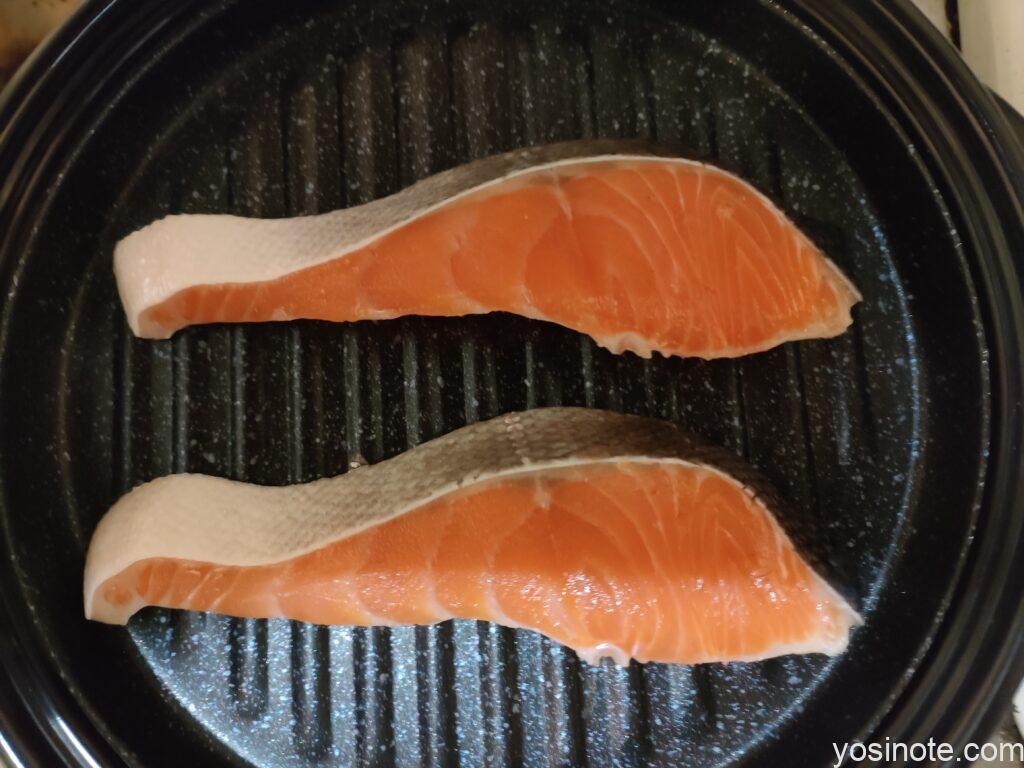 鮭の切り身を2枚焼いてみます。スペース的に、1度に3枚くらいは焼けそうな気がします。